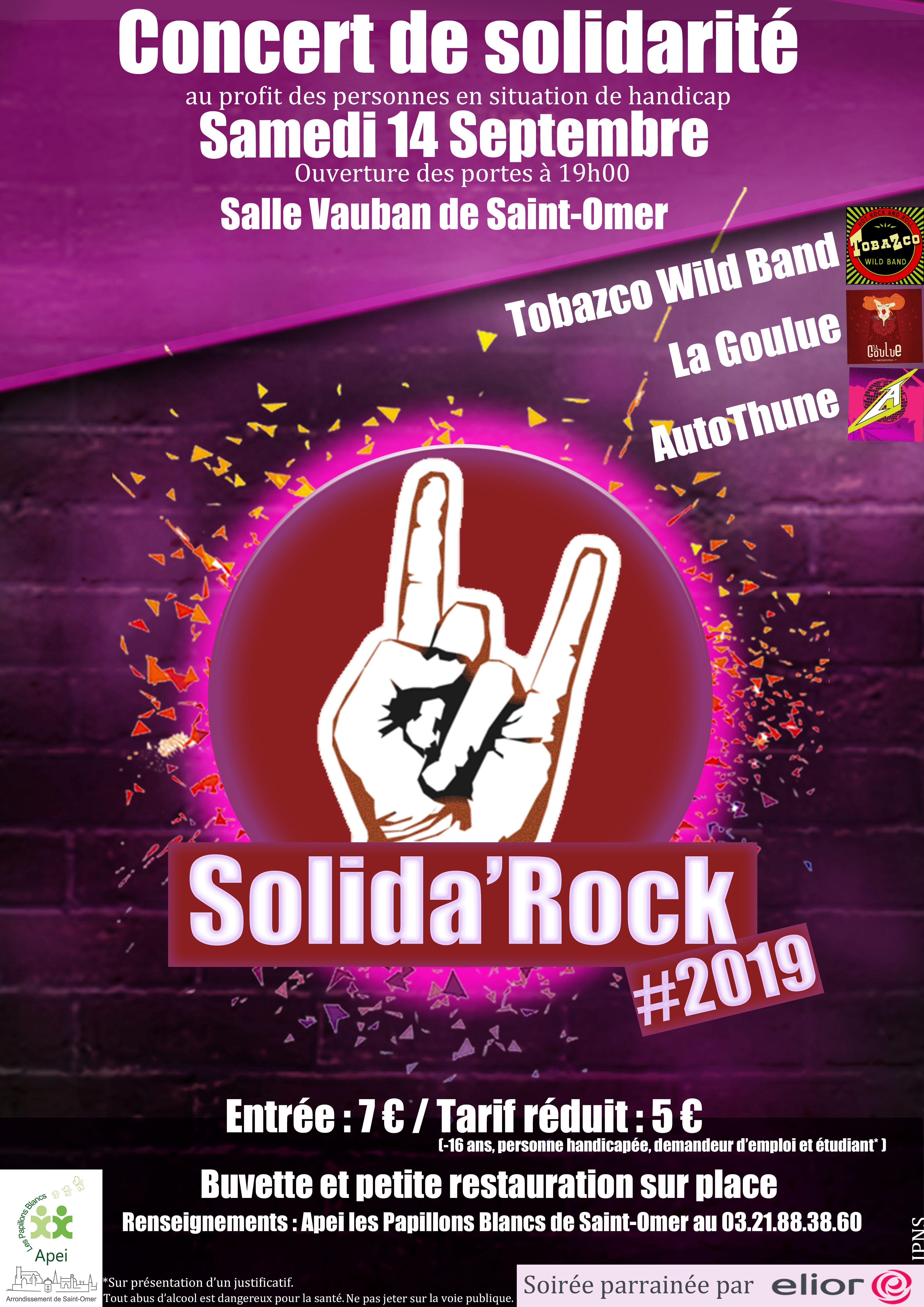 Le 1er concert Solida-Rock#2019 aura lieu le samedi 14 septembre 2019 à partir de 19h à la Salle Vauban (allée des Glacis à St Omer).