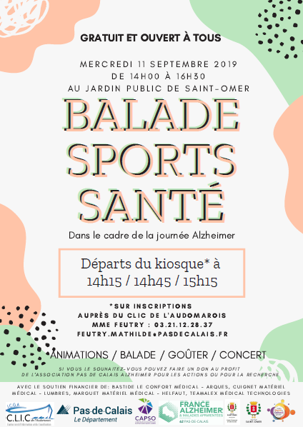 Le CLIC de l’Audomarois (Centre Local d’Information et de Coordination) vous invite à vous balader et découvrir un « Parcours santé Alzheimer » au Jardin Public de Saint-Omer le mercredi 11 septembre 2019 après-midi de 14h00 à 16h30.