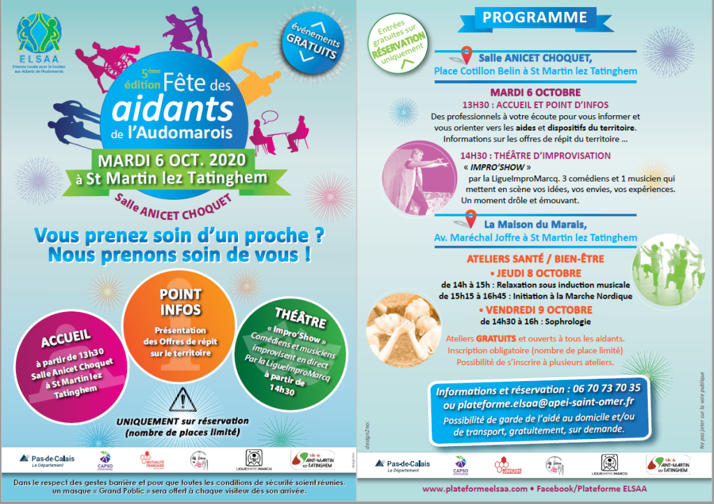 Dans cet esprit, l’équipe d’ELSAA a travaillé à l’organisation de la 5ème édition de la Fête des Aidants de l’Audomarois pour tous les aidants qui aura lieu le mardi 6 octobre 2020, jour de la Journée Nationale des Aidants.