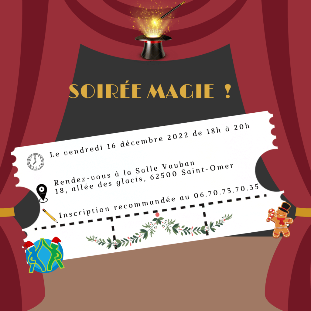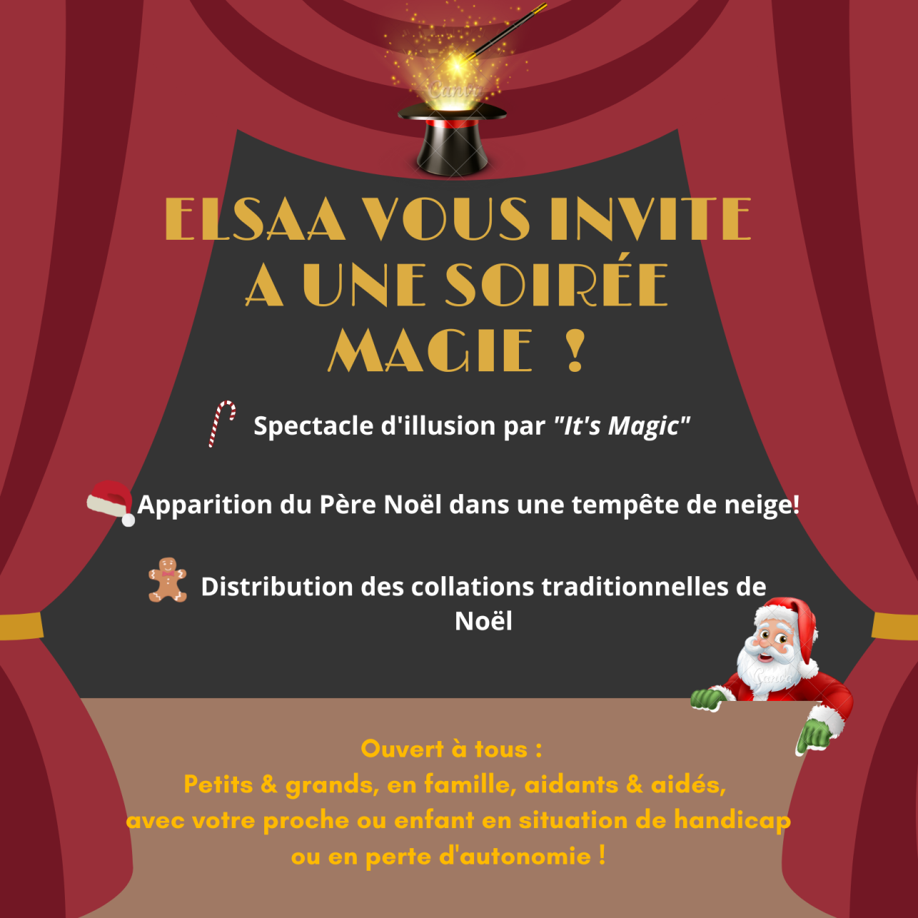 En cette fin d’année 2022, à la veille des vacances de Noël, la Plateforme d’Aide et de Soutien aux Aidants ELSAA, vous invite à une soirée de magie le 16 décembre, à partir de 18h, à la Salle Vauban à St Omer.