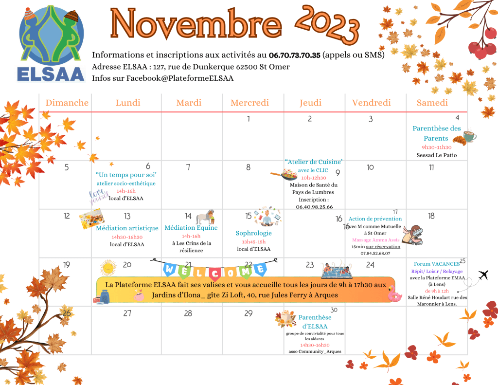 En plus des activités habituelles, ELSAA fera ses valises du 20 au 24 novembre et vous retrouvera dans un gîte à Arques. L’occasion de venir nous rencontrer SANS rdv pour partager un moment, un café, pour profiter de la piscine ou du spa (sur réservation 😉 ). Une semaine riche en rencontres.