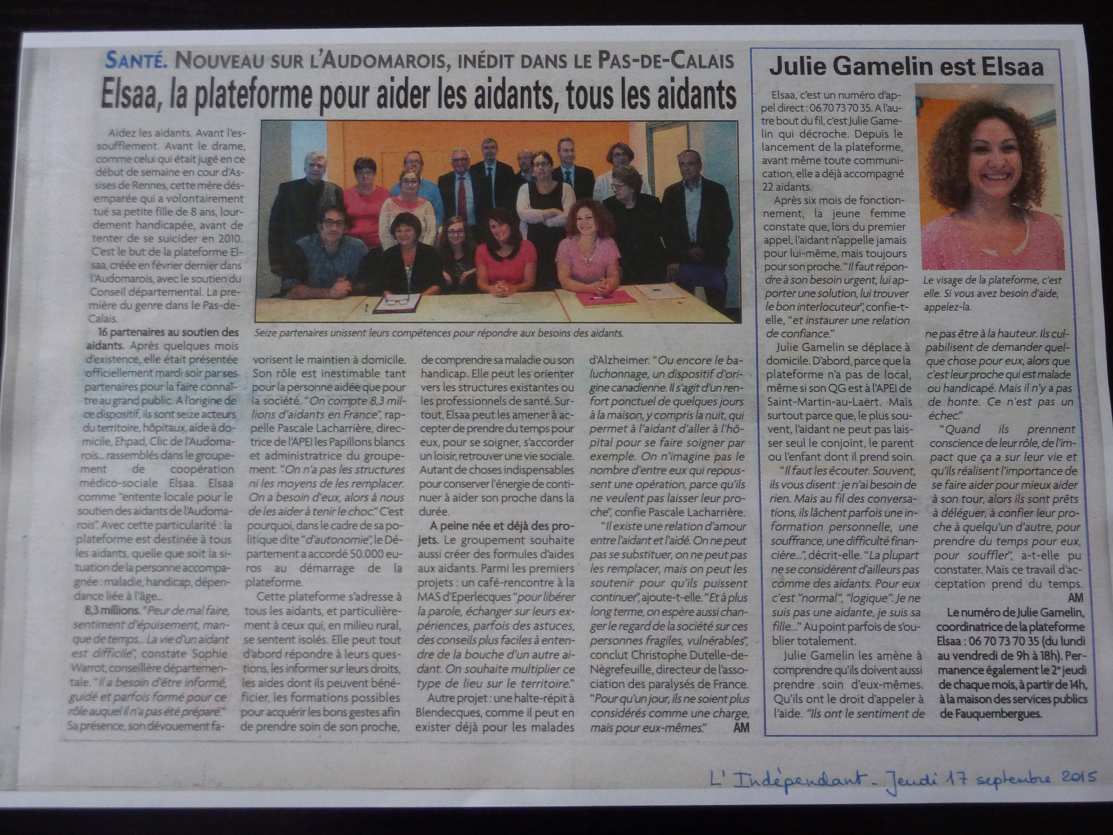 Un très bel article dans le journal « l’Indépendant » du jeudi 17 septembre 2015 sur la Plateforme ELSAA.